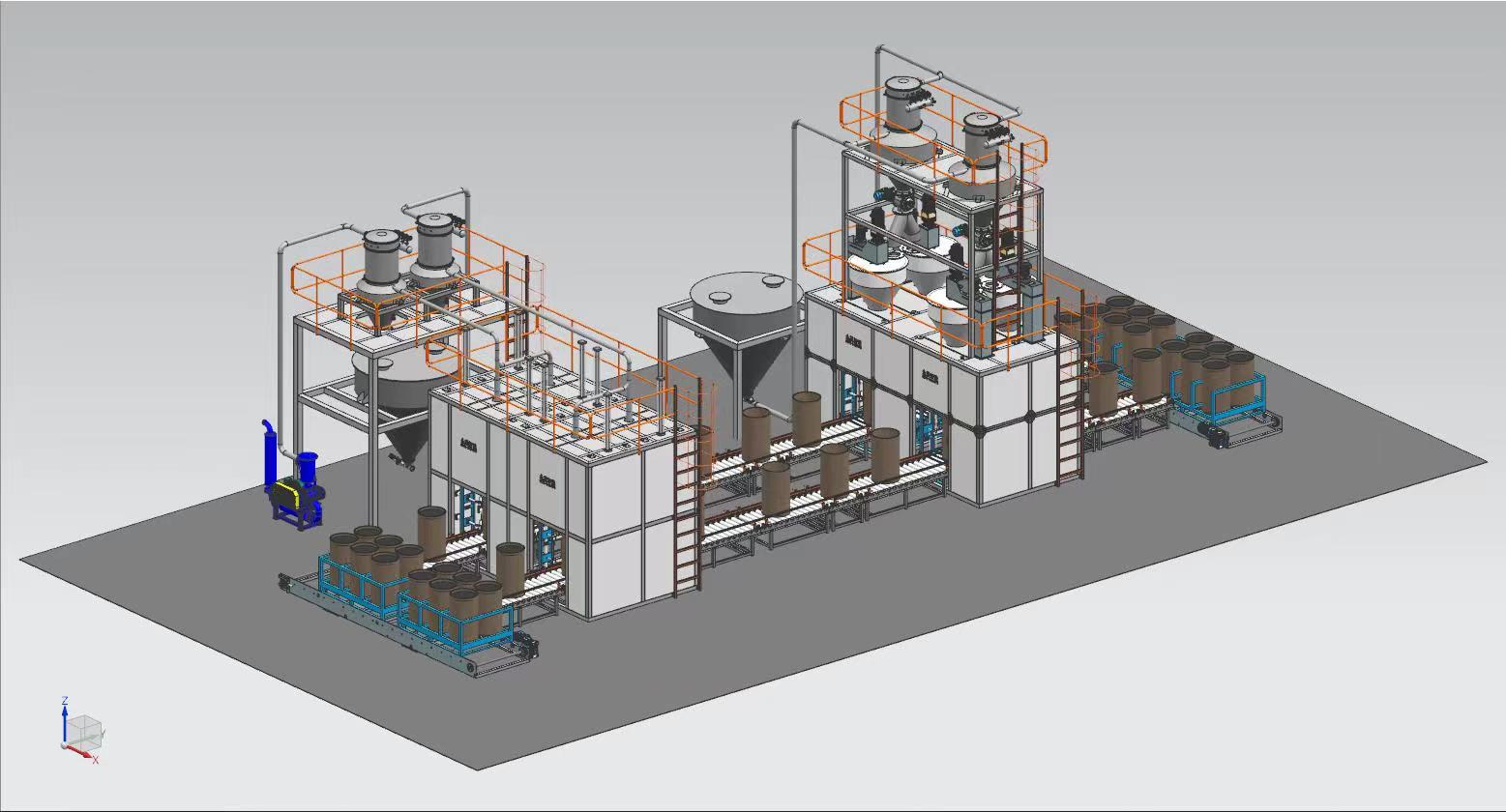 主要解決鋰電池負極材料碳化前后大坩堝加料出料的生產,碳化前坩堝加料采用噸包投料、進行原料緩存,通過滾軸輸送或直接在窯車上實現自動加料,工藝中使用氣力輸送、脫氣裝置進行坩堝填充,使加料過程中粉塵較小,充填更實更多,生產能力按每小兩噸設計;碳化完成后的窯車與坩堝物料從窯爐出來后,經過冷卻到達指定位置后,通過吸料裝置進行液壓破碎吸料,將其物料進行緩存,使用噸袋包裝機進行包裝,實現全自動一站式觖決方案,滿足企業自動化生產工藝要求,系統由噸包投料系統、料倉緩存系統、脫氣填充系統、同步吸料系統、噸袋包裝系統和集成控制系統組成。